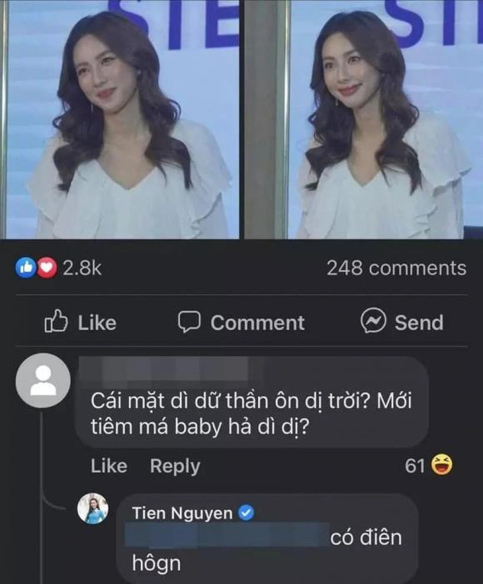 Mới đây, Hoa hậu Thùy Tiên có màn đáp trả khi một cư dân mạng nghi ngờ cô can thiệp thẩm mỹ. Cụ thể, bên dưới hình ảnh mới của Thùy Tiên ở sự kiện, người này để lại bình luận: "Cái mặt dữ thần ôn vậy trời. Mới tiêm má baby hay gì vậy?". Ngay lập tức, Thùy Tiên để lại phản hồi: "Có điên hông?".