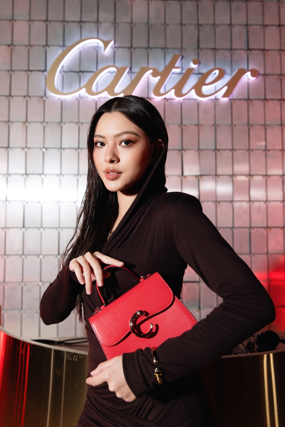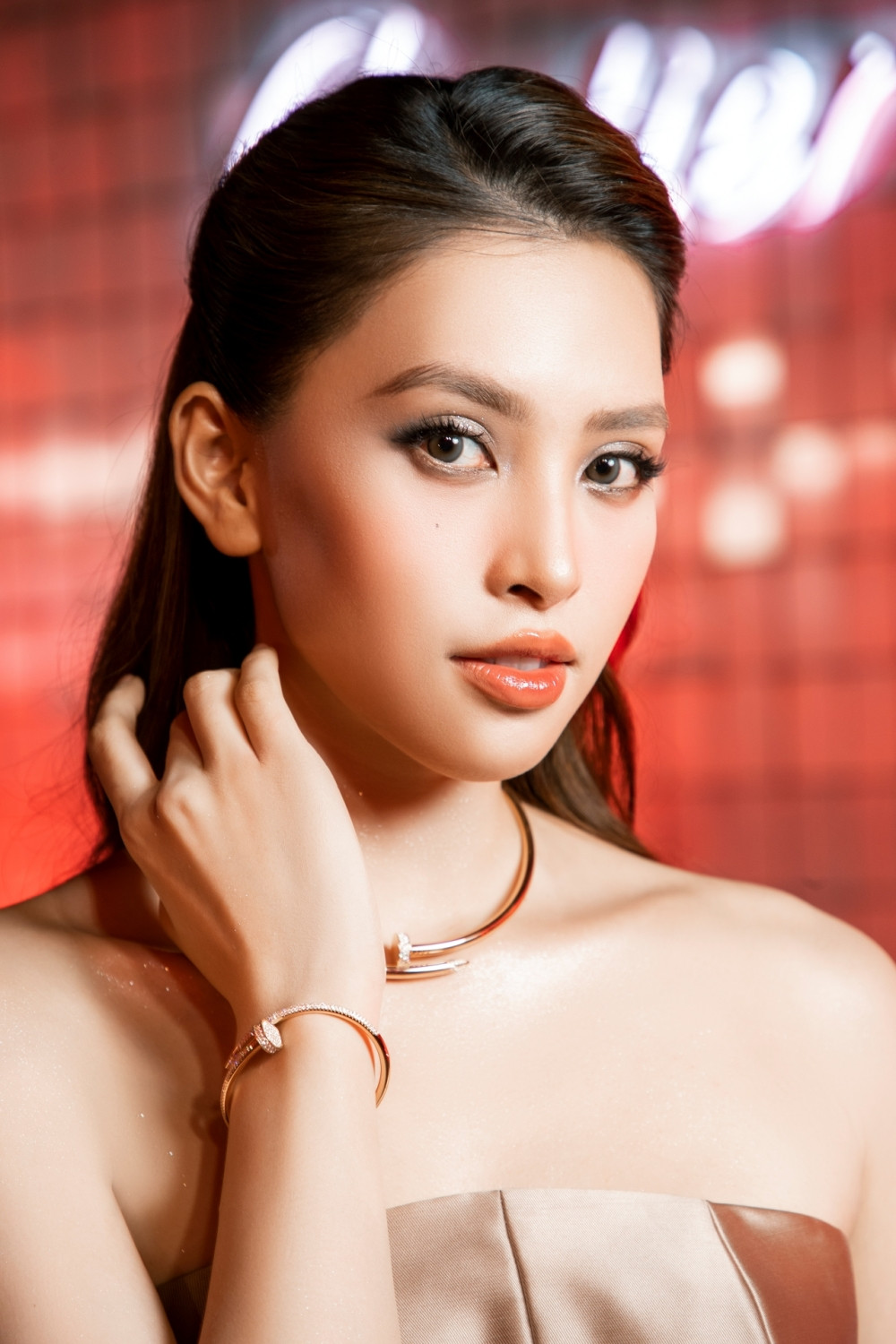 Quán quân The Face Vietnam 2017 Tú Hảo khoe vẻ đẹp ngọt ngào với bộ trang sức, kết hợp mẫu mini bag màu đỏ rực cháy có tổng trị giá hơn 1 tỷ đồng.