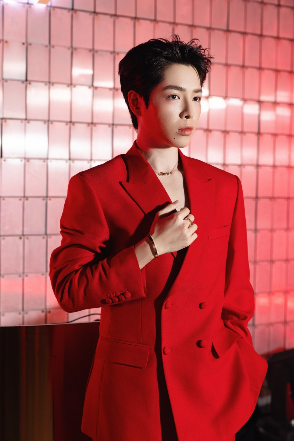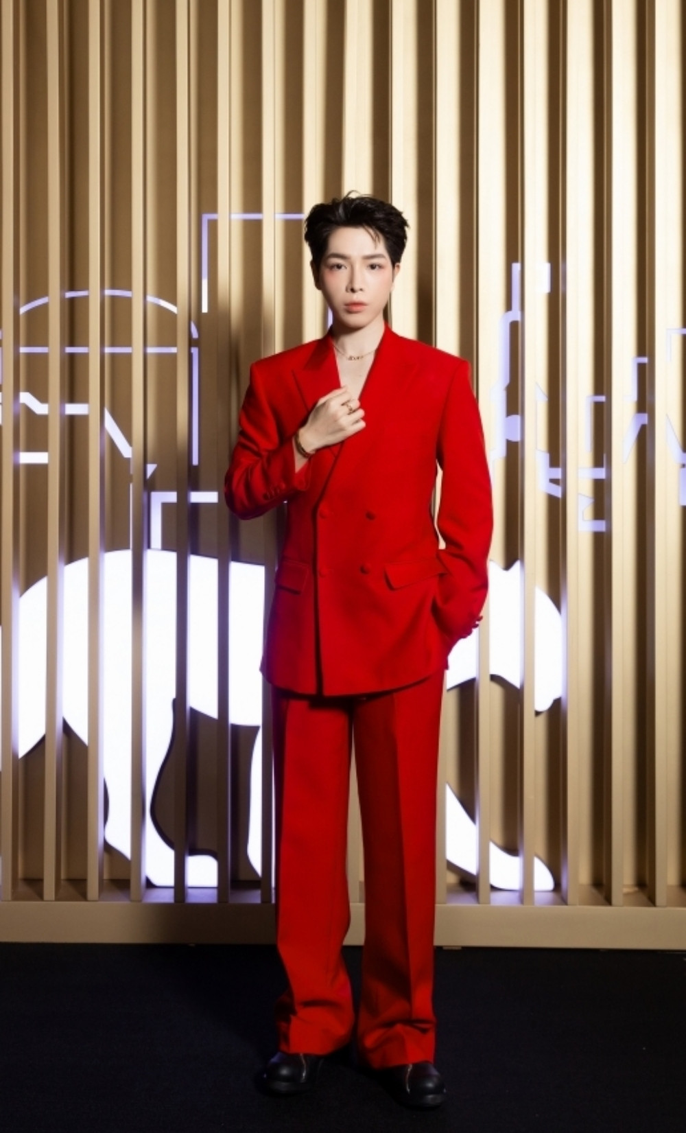 Ca sĩ Đức Phúc có màn xuất hiện gây chú ý với mẫu suit phá cách tông đỏ rực.
