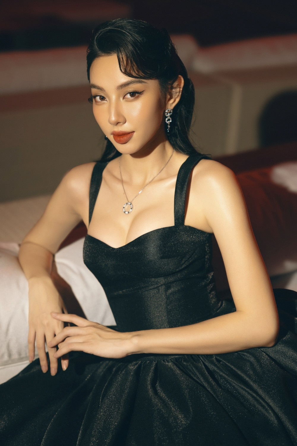 Hoa hậu Thùy Tiên gây ấn tượng mạnh mẽ ngay với phong cách all black, kết hợp cùng layout trang điểm cổ điển nhưng sắc sảo.