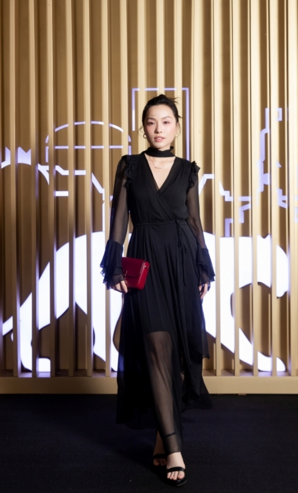 Fashionista Khánh Linh không làm người hâm mộ thất vọng với thiết kế váy lụa bay bổng, phối cùng bộ trang sức vàng tinh xảo.