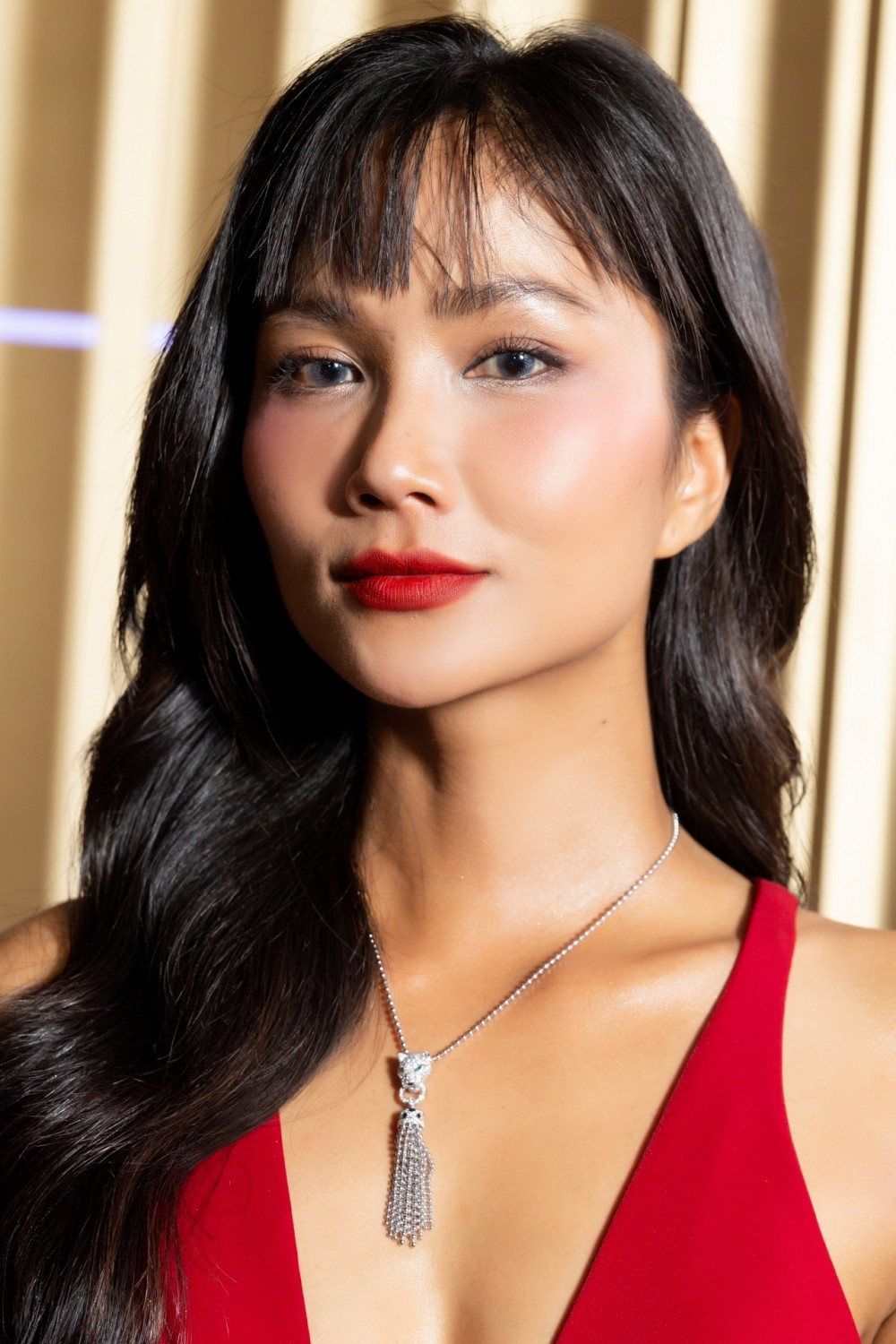 Hoa hậu H’Hen Niê khéo léo mix trang phục tông đỏ sang trọng cùng vòng cổ Panthère De Cartier phiên bản custom độc đáo, điểm xuyết ngọc lục bảo và kim cương với trị giá gần 2,2 tỷ đồng.