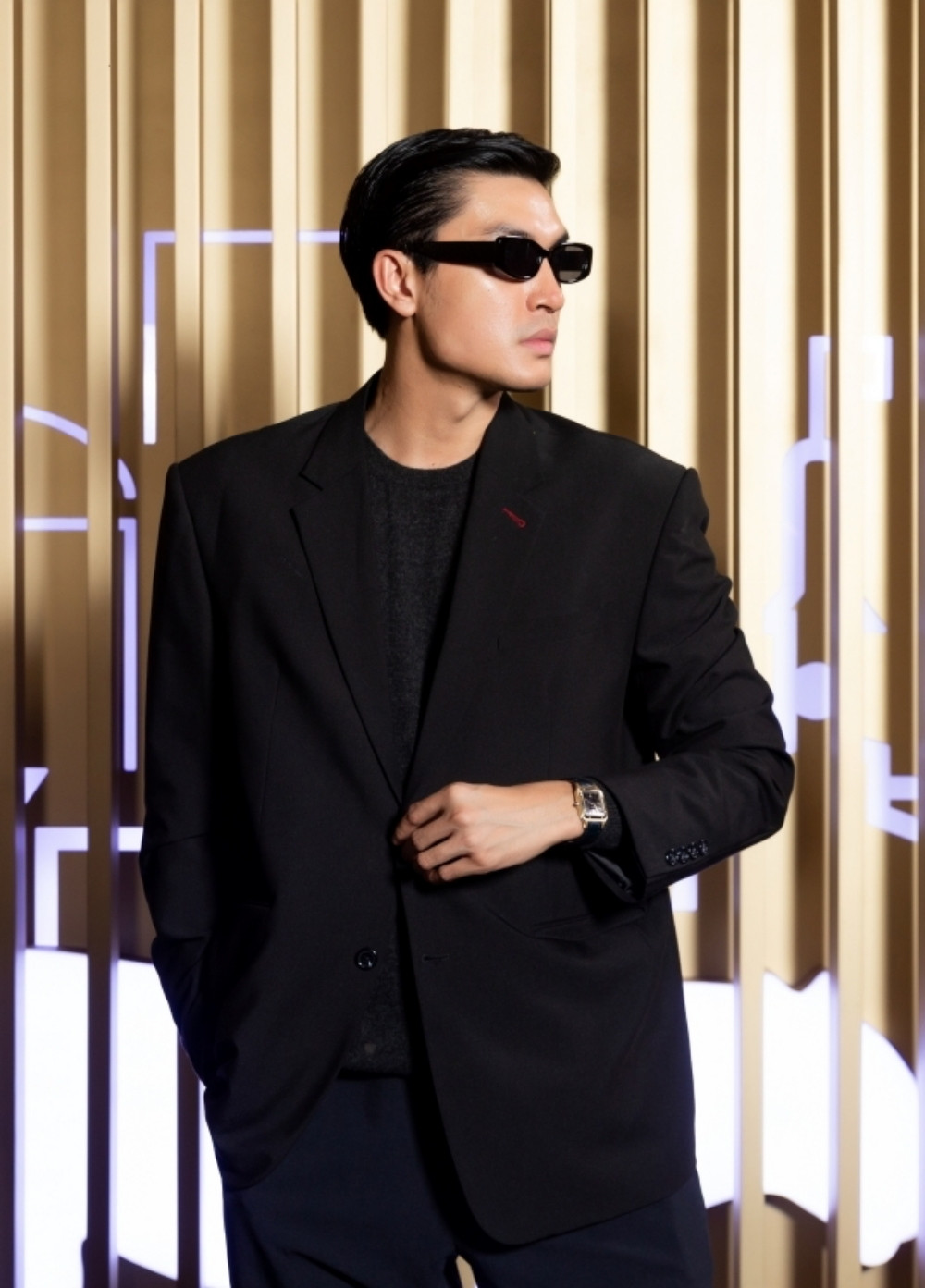 Nam người mẫu, travel blogger Quang Đại diện bộ suit đen kèm cặp mắt kính cá tính, đồng hồ Cartier Santos-Dumont sang trọng.