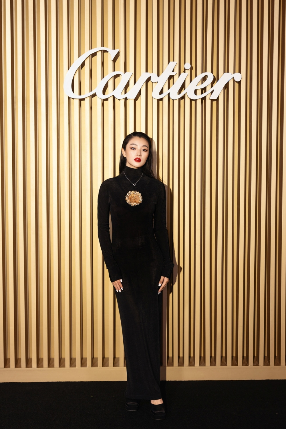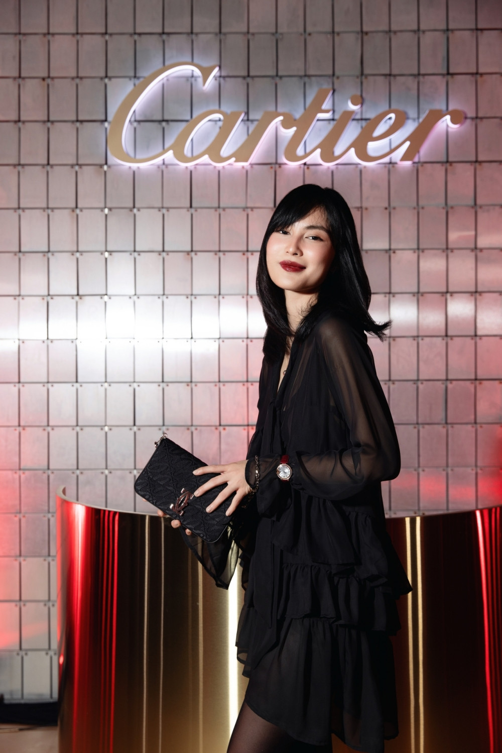Chọn mẫu đầm cúp ngực với những vân hoa in 3D tạo hiệu ứng thị giác, fashionista Châu Bùi mang tới ấn tượng sang trọng, sắc sảo. Người đẹp gốc Hà Thành mix đồ cùng trang sức Clash De Cartier trị giá hơn 2 tỷ đồng.