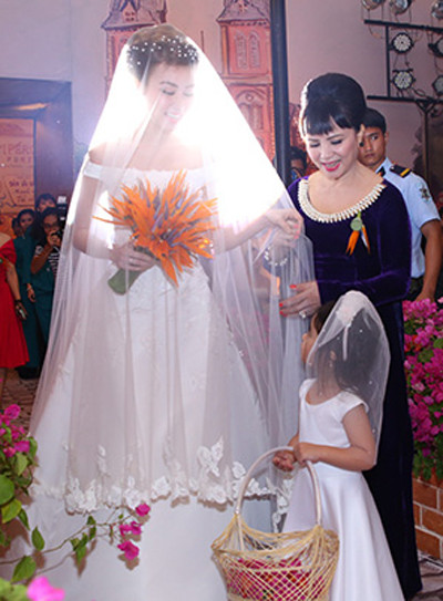 Cô dâu được mẹ ruột dắt tay tiến vào lễ đường.