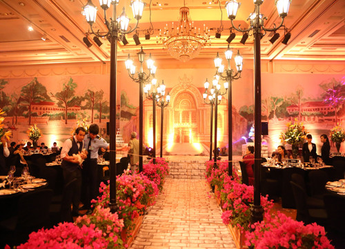 Đám cưới với chủ đề "Đêm phương Đông" của Ngân Khánh - Thiếu Quân có khoảng 300 khách. Tiệc được trang hoàng như một khu phố của Sài Gòn thập niên 1950.