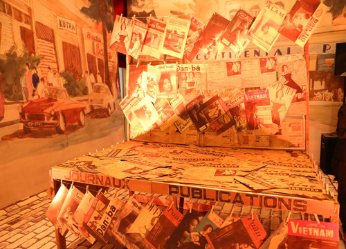 Bàn gallery cách điệu với hình ảnh cô dâu chú rể, được thiết kế trên các tờ nhật trình về điện ảnh và nghệ thuật.