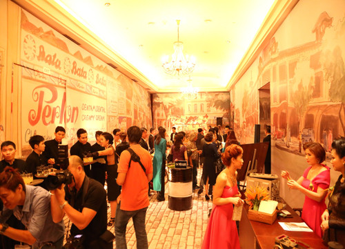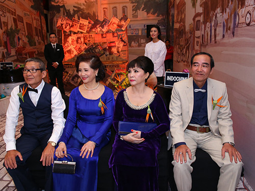 Người thân của cô dâu, chú rể ngồi ở sảnh đón khách. Không gian được trang trí bằng nhiều bức tranh tái hiện hình ảnh Sài Gòn xưa. Cả trang phục áo dài của hai bà mẹ cũng được may theo phong cách áo dài xưa.
