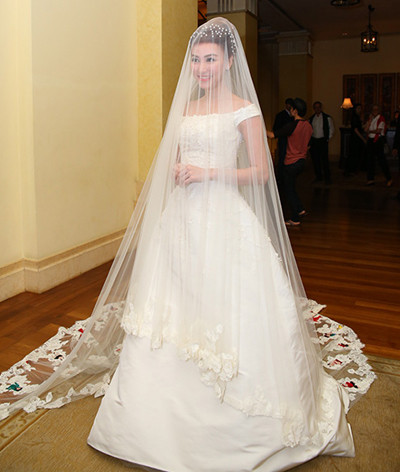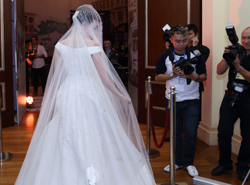 Tiệc cưới của Ngân Khánh và Thiếu Quân diễn ra tối 9/2 tại một khách sạn giữa trung tâm TP HCM. Khác với các đám cưới thông thường, Ngân Khánh và chú rể không ra đón khách mời. Khoảng 20h, nữ diễn viên mới xuất hiện để làm lễ. Cô gây chú ý khi mặc chiếc váy cưới đơn giản nhưng có phần đuôi của mạng che mặt dài đến vài mét.
