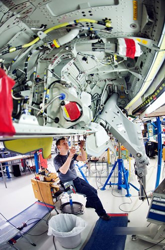 Những người thợ lành nghề lắp ráp dây điện bên trong một chiếc Gripen.