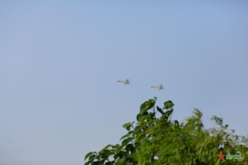 | Tiếng động cơ phản lực, kết hợp với động tác chao lượn trên không của máy bay Su-30MK2 tạo ấn tượng mạnh mẽ, cuốn hút. |
