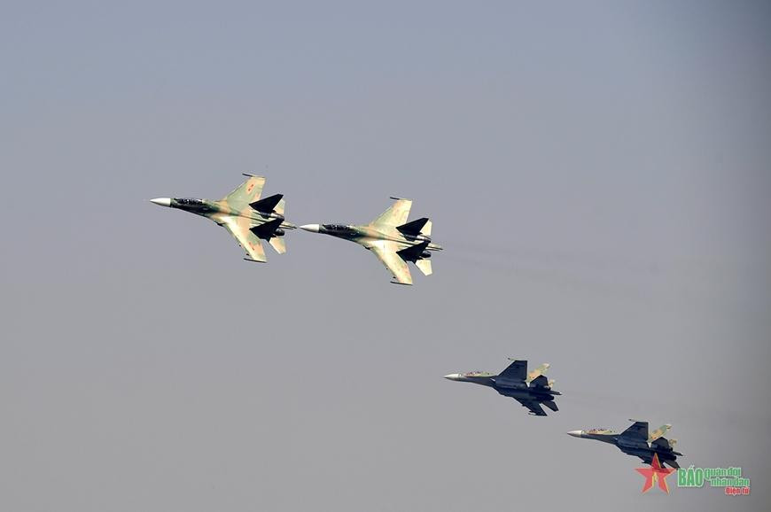 | Các máy bay Su-30Mk2 và trực thăng Mi đang luyện tập chuẩn bị tham gia Triển lãm Quốc phòng quốc tế Việt Nam 2022 dự kiến sẽ diễn ra tại khu vực sân bay Gia Lâm (Hà Nội) từ ngày 8 đến 10-12 và là triển lãm quốc phòng quốc tế lần đầu tiên do Bộ Quốc phòng Việt Nam tổ chức. |