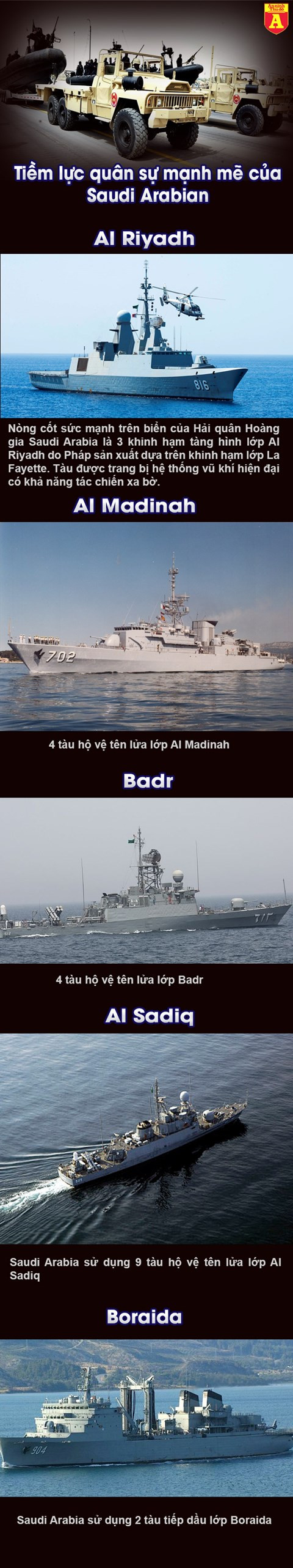 Hải quân quốc gia này cũng đang biên chế 4 chiếc tàu hộ vệ tên lửa lớp AI Madinah, 4 tàu hộ vệ tên lửa lớp Badr, 9 tàu hộ vệ tên lửa lớp AI Sadiq và hai chiếc tàu tiếp dầu khổng lồ lớp Boraida do Pháp chế tạo. Với trang bị như thế đã đưa quốc gia này thành một lực lượng hải quân đáng gờm trong khu vực.