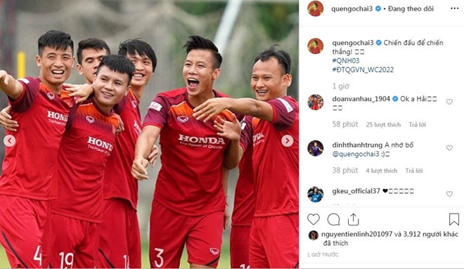 Trận hòa trên sân khách trước đối thủ đầy duyên nợ Thái Lan của thầy trò HLV Park Hang-seo khiến cổ động viên hài lòng. Sau trận đấu, đội trưởng Quế Ngọc Hải thể hiện quyết tâm cũng như cám ơn sự cổ vũ của người hâm mộ bằng nhiều status, hình ảnh. Ảnh chụp màn hình.