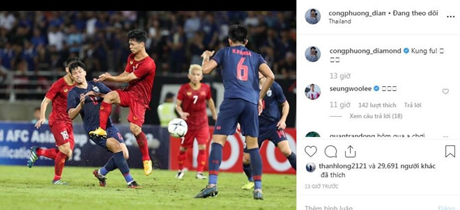 Công Phượng khiến fan bật cười vì hình ảnh mới nhất trên trang cá nhân. Khoảnh khắc "kungfu" trên sân cỏ của chân sút quê Nghệ An được nhiều người "thả tim".  Trong đó bình luận vỗ tay cổ vũ của "Messi Hàn" Lee Seung-woo - người đang thi đấu chung CLB STVV với Công Phượng - được chú ý hơn cả. Ảnh chụp màn hình.