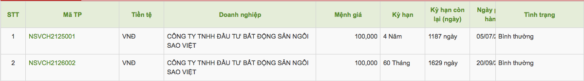 Dữ liệu tại Sở Giao dịch Chứng khoán Hà Nội (HNX) cho thấy, năm 2021, Công ty Ngôi Sao Việt phát hành 2 lô trái phiếu: NSVCH2125001, NSVCH2126002 với giá trị lần lượt 800 tỷ đồng và 1.900 tỷ đồng.