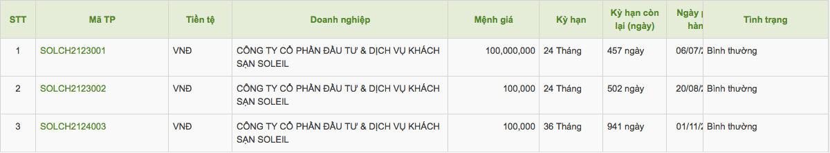 Cụ thể: Lô trái phiếu mã SOLCH2123001 trị giá 800 tỷ đồng phát hành ngày 6/7/2021. Lô trái phiếu mã SOLCH2123002 trị giá 450 tỷ đồng phát hành ngày 20/8/202. Lô trái phiếu mã SOLCH2124003 trị giá 500 tỷ đồng phát hành ngày 1/11/2021. Mục đích phát hành là hợp tác kinh doanh dự án khu du lịch phức hợp Hoàng Hải tại khu 5 thuộc xã Dương Tơ, Phú Quốc, Kiên Giang.