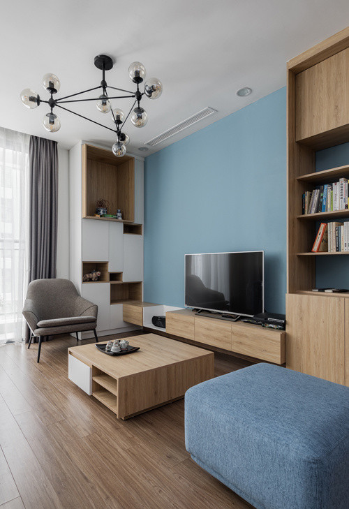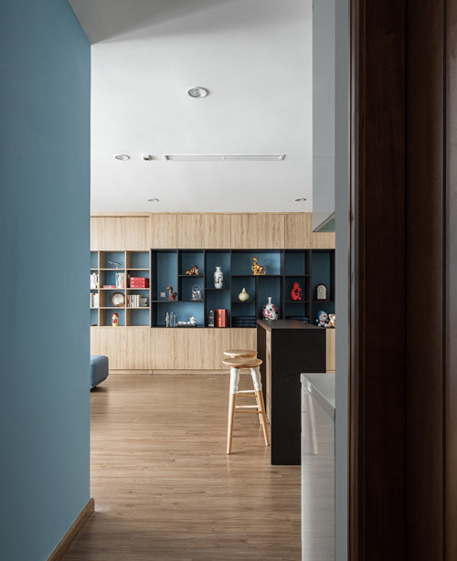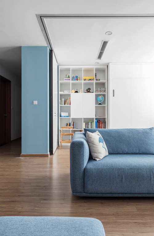 Màu xanh cùng tông gỗ sáng được chọn làm tông chủ đạo cho nhà. Sắc độ xanh vừa phải giúp các phòng tươi sáng, có cảm giác bình yên, mát mẻ.