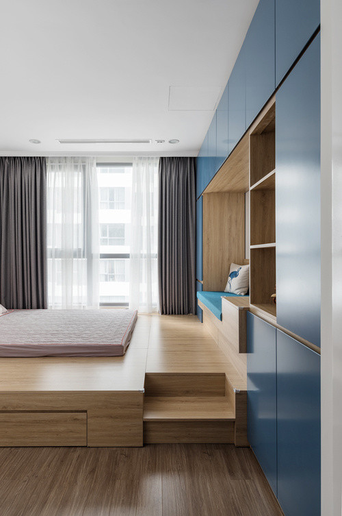 Vì hai con còn nhỏ nên gia đình lựa chọn ở chung một phòng ngủ lớn. Kiến trúc sư gợi ý kiểu phản thay cho giường thông thường đảm bảo chỗ nằm linh hoạt cho cả nhà.