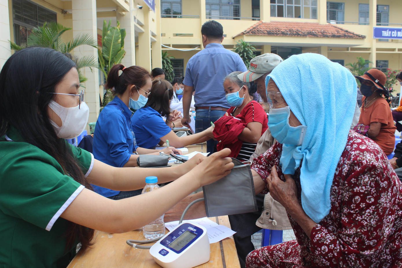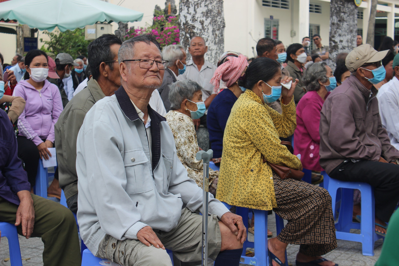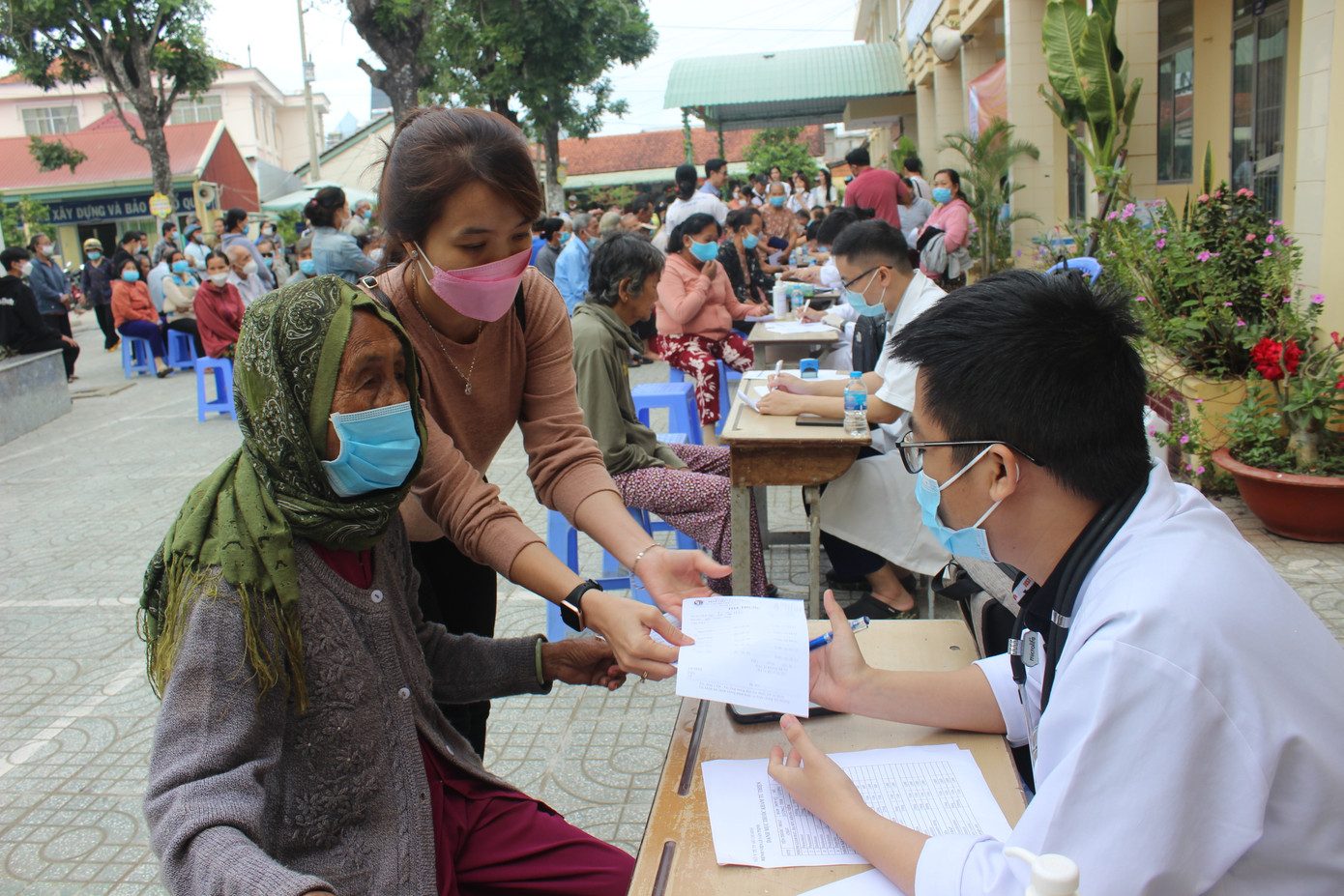 | Sau lễ khai mạc, chương trình chính khám bệnh cho bà con được diễn ra. Bà con xếp hàng lần lượt chờ các bác sĩ thăm khám. |