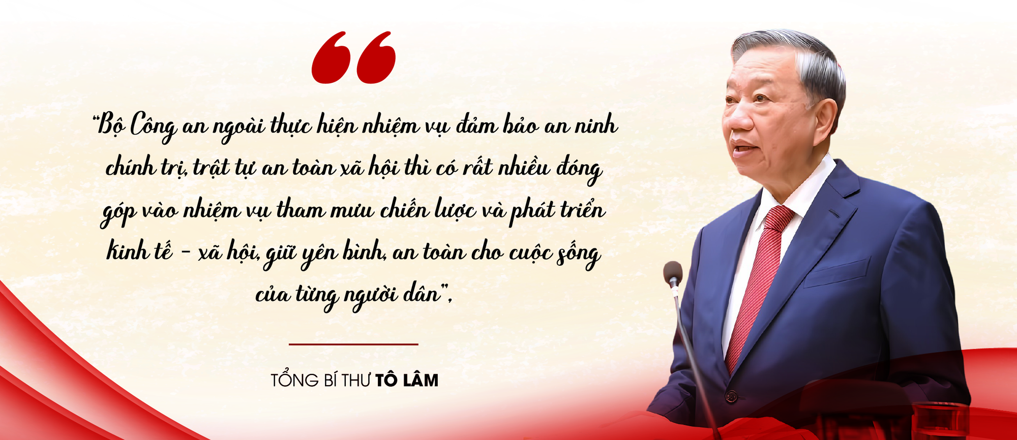 “Bộ Công an ngoài thực hiện nhiệm vụ đảm bảo an ninh chính trị, trật tự an toàn xã hội thì có rất nhiều đóng góp vào nhiệm vụ tham mưu chiến lược và phát triển kinh tế - xã hội, giữ yên bình, an toàn cho cuộc sống của từng người dân”, Tổng Bí thư bày tỏ.