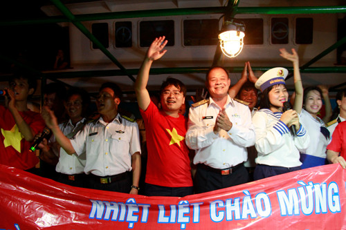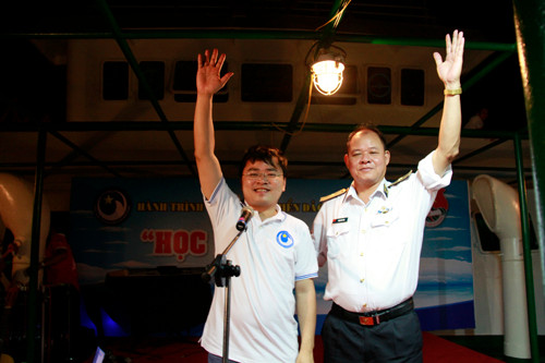 Bí thư T.Ư Đoàn Nguyễn Anh Tuấn và Chuẩn đô đốc, Phó chủ nhiệm chính trị Quân chủng Hải quân Phạm Văn Sơn phát động thi đua trên tàu Hành trình Tuổi trẻ vì biển đảo quê hương 2015.