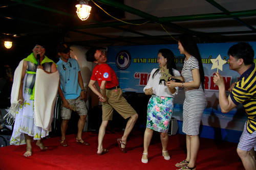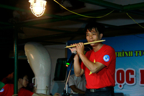 Các thành viên sinh hoạt văn nghệ trên boong tàu 996 dưới ánh trăng.