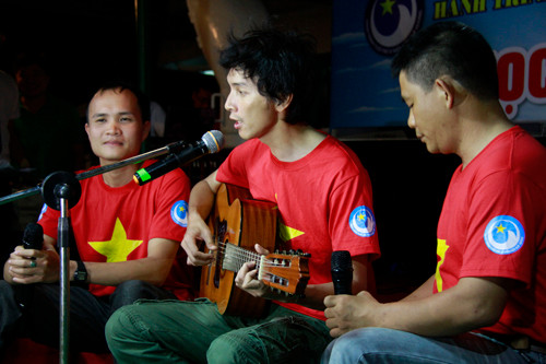 Tác giả Lê Việt Khánh (giữa) biểu diễn ca khúc “Bay qua Biển Đông” do anh sáng tác.