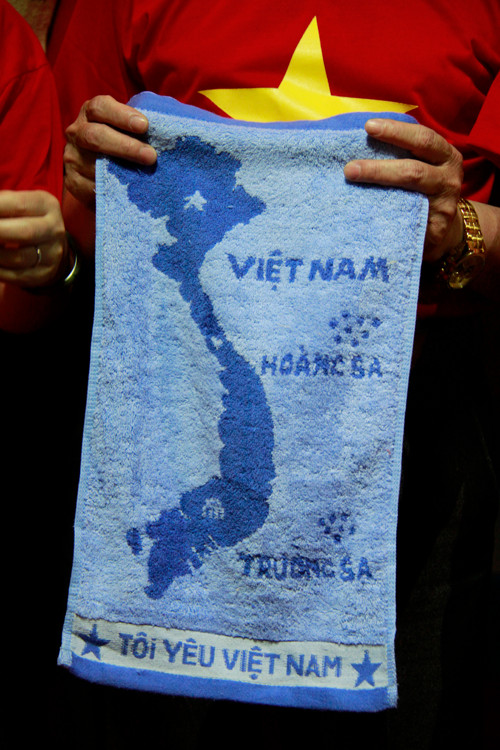 Chiếc khăn mặt có in hình bản đồ Tổ quốc có hai quần đảo Hoàng Sa, Trường Sa của thành viên trên tàu.