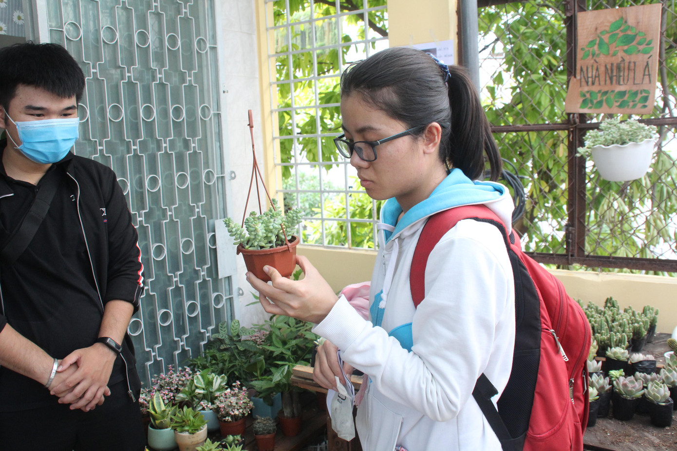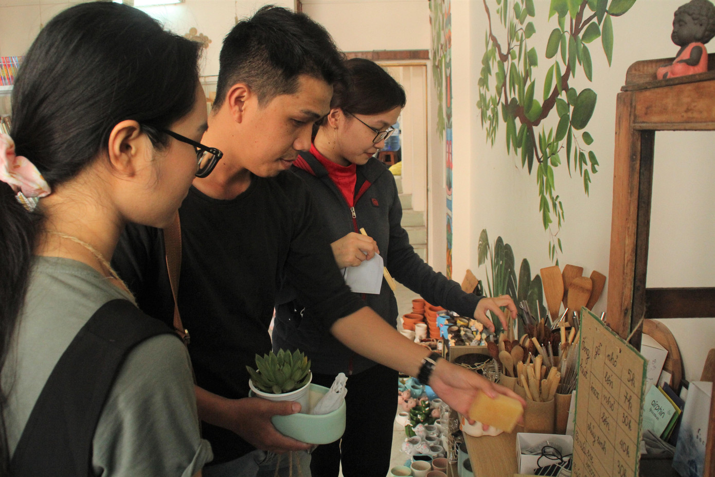 | Ngoài hoạt động "đổi pin lấy cây", Nhà nhiều Lá còn bán các sản phẩm cây xanh, các sản phẩm tái chế | |