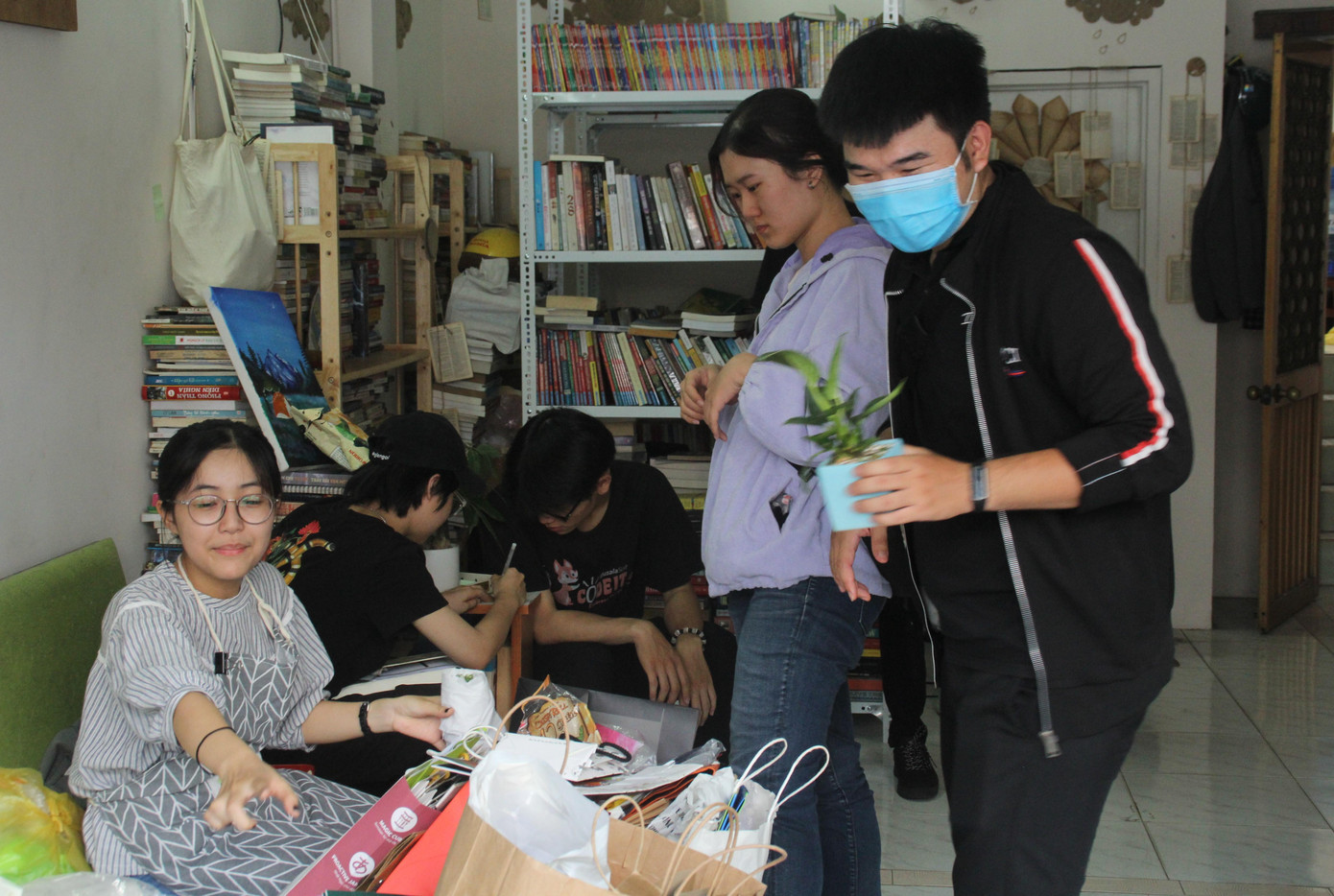 | Bạn trẻ mang pin đã qua sử dụng đến Nhà nhiều Lá để đổi lấy cây xanh |