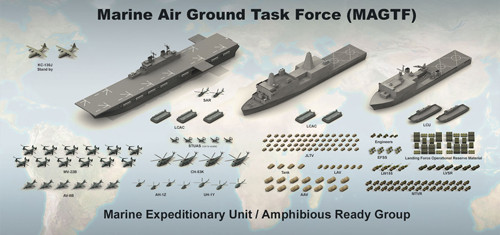 Đơn vị Hỗn hợp Không, Bộ của Thủy quân Lục chiến Mỹ (MAGTF) là linh hồn trong cách thức tổ chức chiến đấu của Thủy quân Lục chiến Mỹ. Biên chế của MAGTF không cố định, có thể thay đổi tùy theo tình hình. Đó có thể là đơn vị 500 lính đặc nhiệm triển khai phía trước ở châu Âu, hay các lữ đoàn viễn chinh (MEB) được xây dựng quanh trung đoàn bộ binh thủy quân lục chiến 15.000 quân, hoặc Lực lượng Viễn chinh 40.000 quân (MEF), theo USNI.