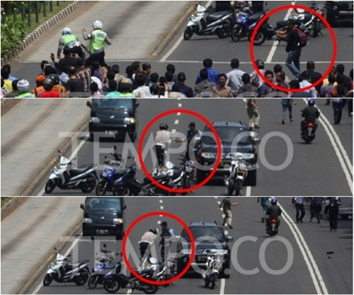 Trang tin Metro Tempo của Indonesia đăng loạt ảnh, cho thấy hai người đàn ông không rõ danh tính chĩa súng vào cảnh sát. Vụ việc xảy ra gần hiện trường nổ bom ở quán cà phê Starbucks, theo Guardian.