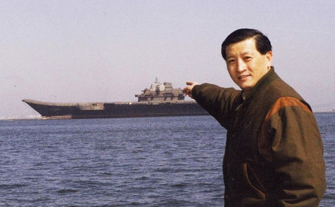 Xu Zengping chỉ tay hướng tàu sân bay Liêu Ninh tháng 3/2002. Ảnh: SCMP