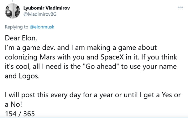 Điều mà Vladimirov muốn ở nhà sáng lập SpaceX là sự cho phép sử dụng tên của Elon và các logo của công ty SpaceX. Vladimirov viết: “Elon thân mến, tôi là người phát triển game và tôi đang làm một game về sao Hỏa với anh và SpaceX trong đó. Nếu anh nghĩ ý tưởng này hay, thì tôi chỉ cần anh cho phép dùng tên anh và các logo. Tôi sẽ nhắn cho anh như thế này mỗi ngày, suốt một năm, hoặc cho đến khi tôi nhận được câu trả lời là Có hay Không”. Kèm với đó, Vladimirov luôn viết số lần đã gửi tweet cho Elon trong mục tiêu là 365 tweet cho 365 ngày, ví dụ: 150/365, 151/365…