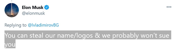 Cuối cùng, Elon - CEO của Tesla, “sếp” của SpaceX và người giàu nhất thế giới - đã đáp lại tin nhắn thứ 154 của Vladimirov: “Cậu có thể lấy tên/ logo của chúng tôi và chúng tôi có lẽ sẽ không kiện cậu đâu”.
