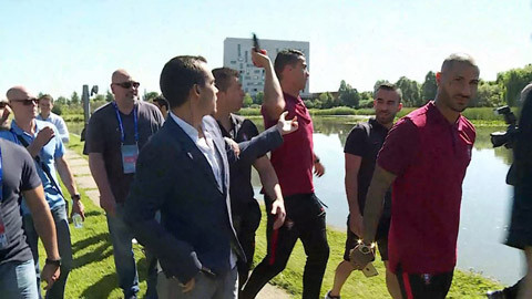 Chiều 21/6 vừa qua (giờ địa phương), sau khi kết thúc buổi tập Ronaldo đã bị cánh phóng viên bám riết. Có lẽ do quá ức chế nên siêu sao của Real Madrid đã chọn cách giải tỏa căng thẳng bằng cách giật chiếc mic phỏng vấn của phóng viên đồng hương rồi ném thẳng xuống hồ nước gần đó, sau đó thản nhiên bỏ đi.