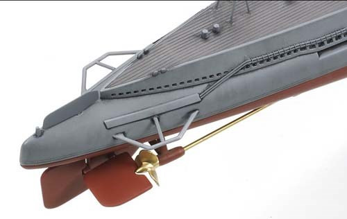 Mô hình phía đuôi tàu ngầm với chân vịt và bánh lái.