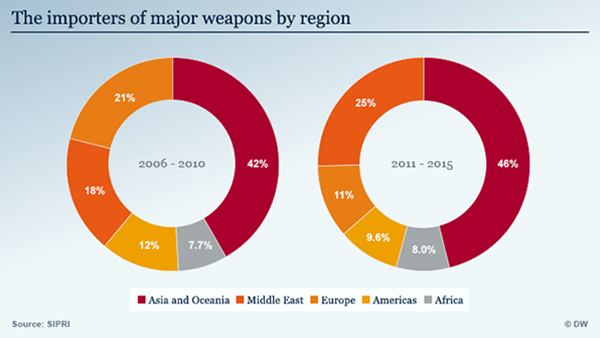 Theo các chuyên gia của SIPRI, thị trường buôn bán vũ khí toàn cầu đã tăng 14% trong giai đoạn 2011 – 2015 so với giai đoạn 2006 – 2010. Khu vực nhập khẩu vũ khí nhiều nhất là châu Á và Trung Đông. Trong giai đoạn 2011 – 2015, hai khu vực này đã nhập khẩu 71% tổng số vũ khí toàn cầu (trong đó, khu vực Châu Á 46%, khu vực Trung Đông 25%). Danh sách năm quốc gia nhập khẩu vũ khí nhiều nhất, bao gồm: Ấn Độ, Saudi Arabia, Trung Quốc, United Arab Emirates (UAE) và Thổ Nhĩ Kỳ.
