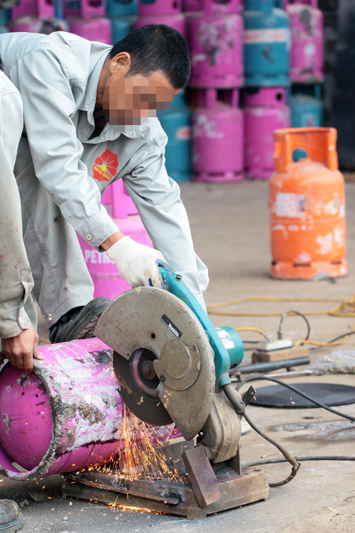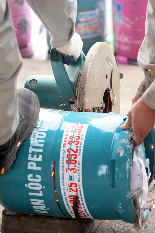 Những bình gas kém chất lượng và hết hạn sử dụng được xẻ ra làm hai. Trong buổi sáng, hơn 100 bình gas bị phá huỷ bằng cách này.
