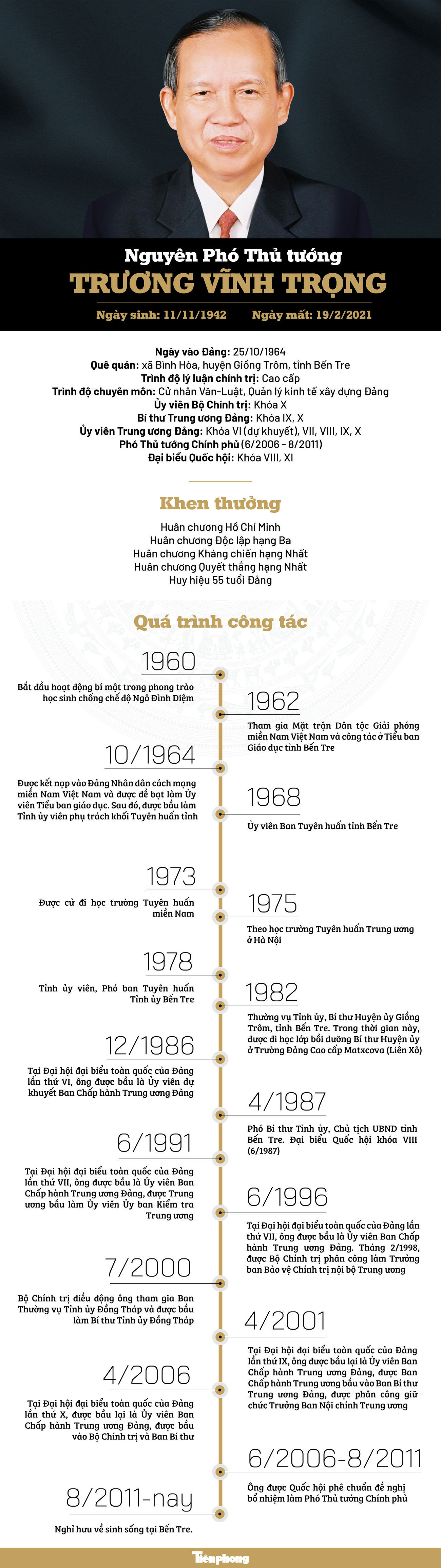 TPO - Sau một thời gian lâm bệnh, mặc dù được Đảng, Nhà nước, tập thể các giáo sư, bác sĩ tận tình cứu chữa, gia đình hết lòng chăm sóc, nhưng do tuổi cao, sức yếu, bệnh nặng, nguyên Phó Thủ tướng, nguyên Trưởng Ban Nội chính Trung ương Trương Vĩnh Trọng đã từ trần vào hồi 3 giờ 25 phút ngày 19/2/2021.