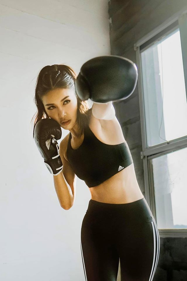 Minh Tú khoe eo thon gợi cảm với trang phục thể thao khi tập luyện boxing.
