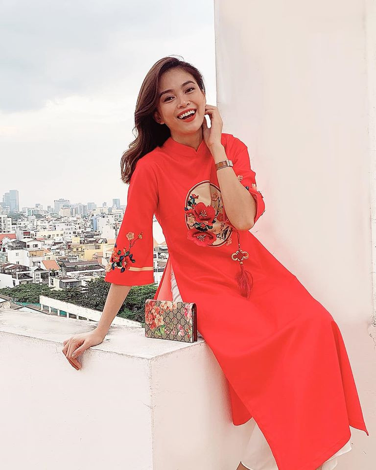 Á hậu Mâu Thuỷ mang không khí mùa xuân đến gần với áo dài đỏ rực.