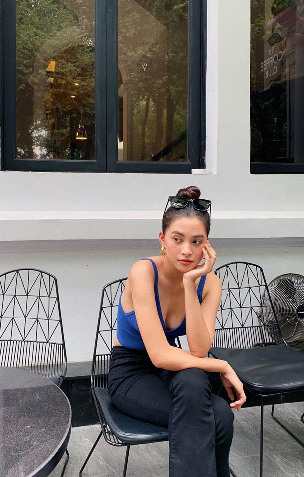 Tiểu Vy kết hợp cùng quần jeans đơn giản màu đen và các phụ kiện túi xách, kính mát màu đen basic nhưng vẫn cực cá tính, sành điệu.