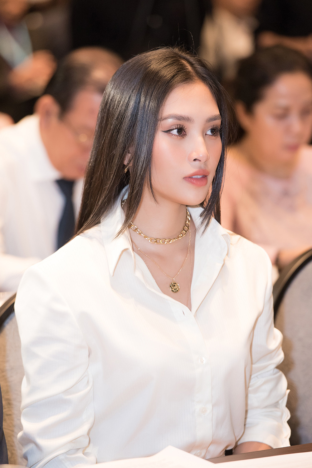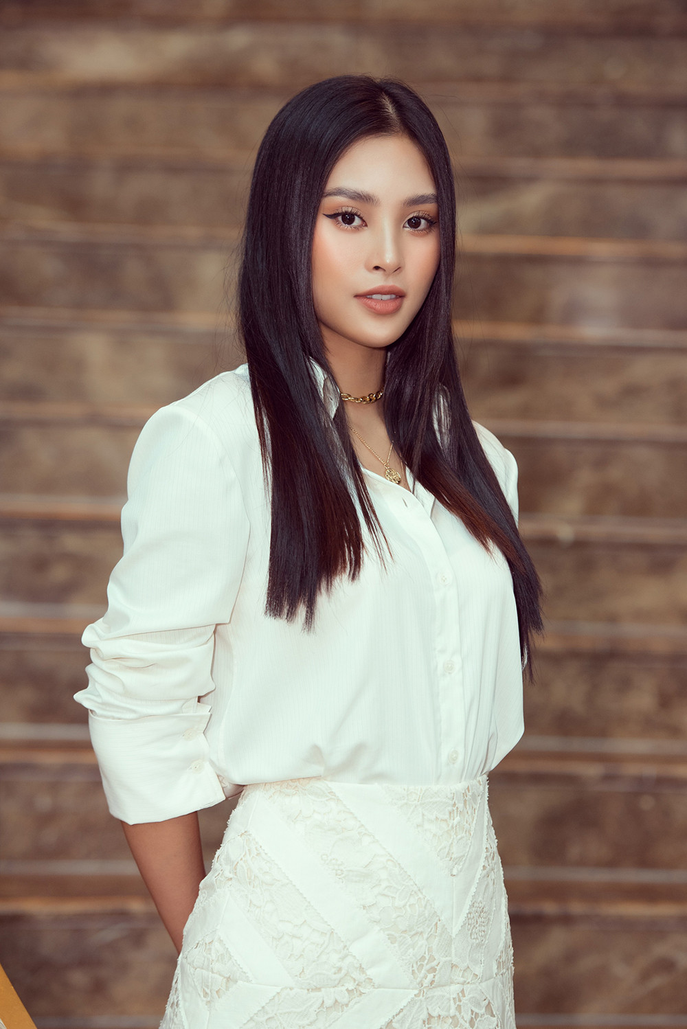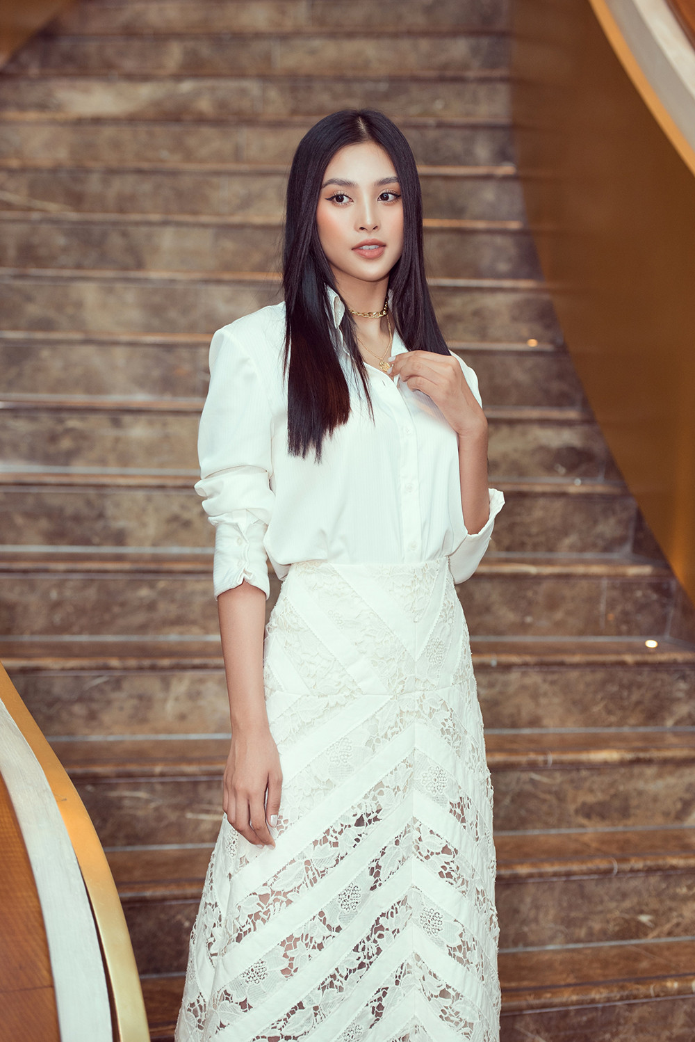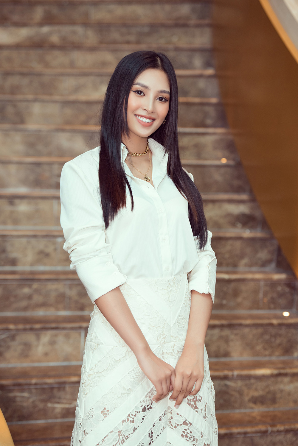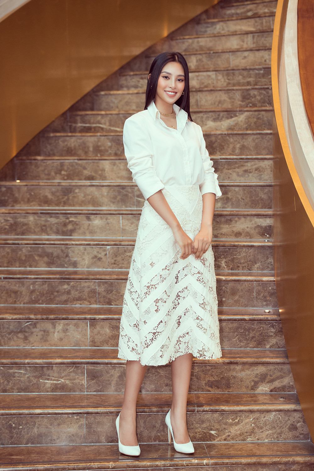 Mặc dù chỉ diện áo sơ-mi trắng giản dị nhưng Tiểu Vy vẫn nổi bật bởi nhan sắc cực rạng rỡ và xinh đẹp.