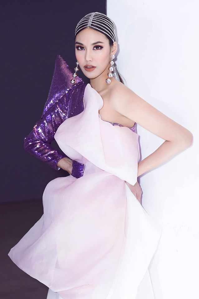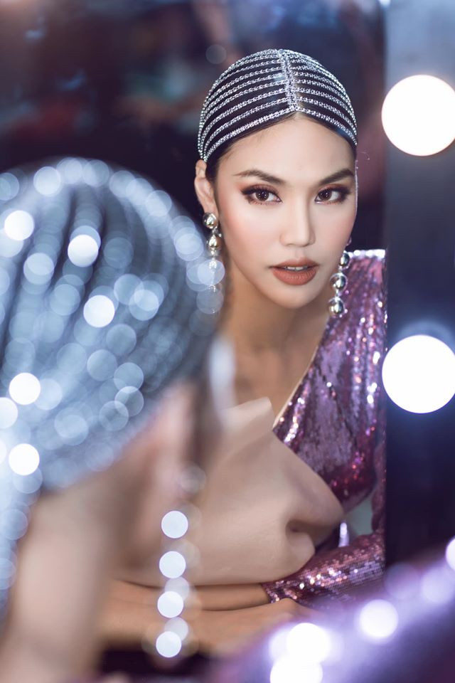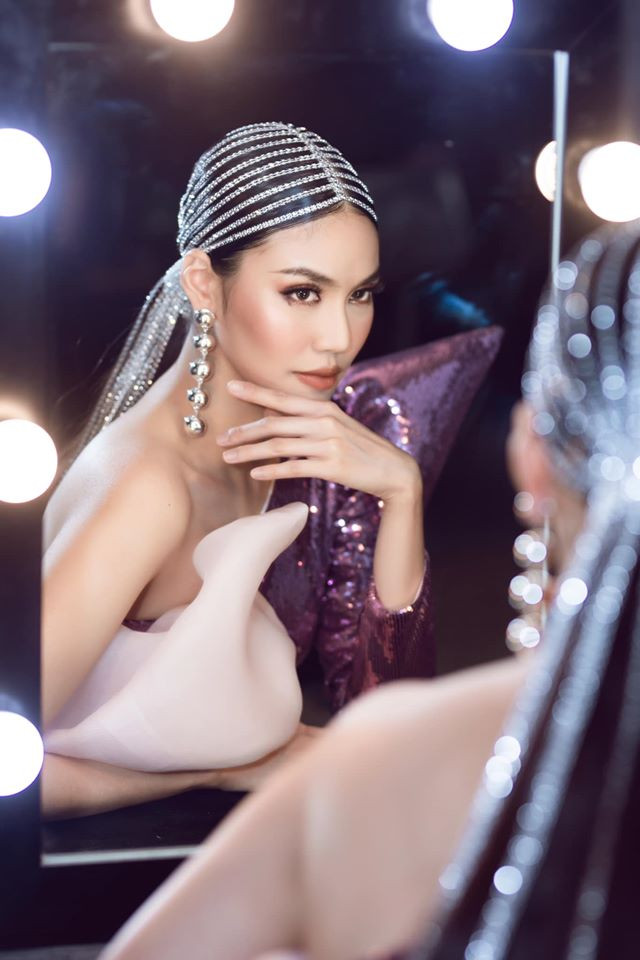 Người đẹp gây chú ý với mái tóc được đính đá cầu kỳ, tạo hình như một nữ thần kiêu sa và quyến rũ.