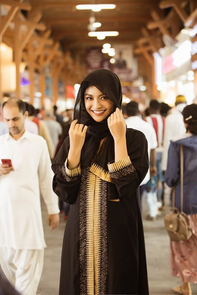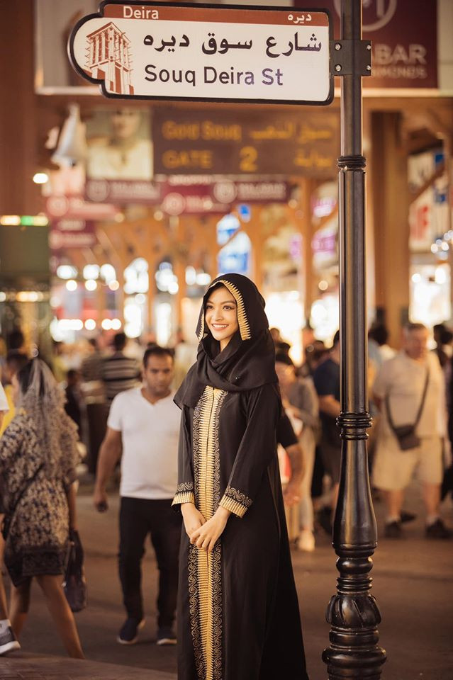 Á hậu Kiều Loan mặc trang phục Kandura đi thăm quan Dubai.