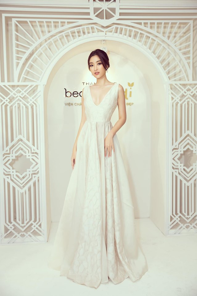Hoa hậu Việt Nam 2018 thay một mẫu váy trắng xẻ đùi gợi cảm khác sau đó.
