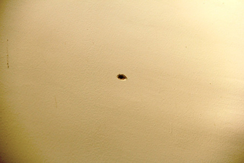 Công an ghi nhận 2 vết thủng trên tường và trần nhà nghi do đạn bắn, một đầu đạn bằng chì cũng được công an tìm thấy.