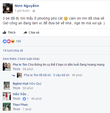 Sau khi anh đăng tải thông tin trên mạng, vào lúc 22h cùng ngày, anh nhận được tin có người tìm thấy 3 bé đi lạc lên khu vực phường Phú Cát, TP Huế. Khi tìm được các bé, người dân đã báo cho Công an phường Phú Cát đưa về trụ sở công an phường.